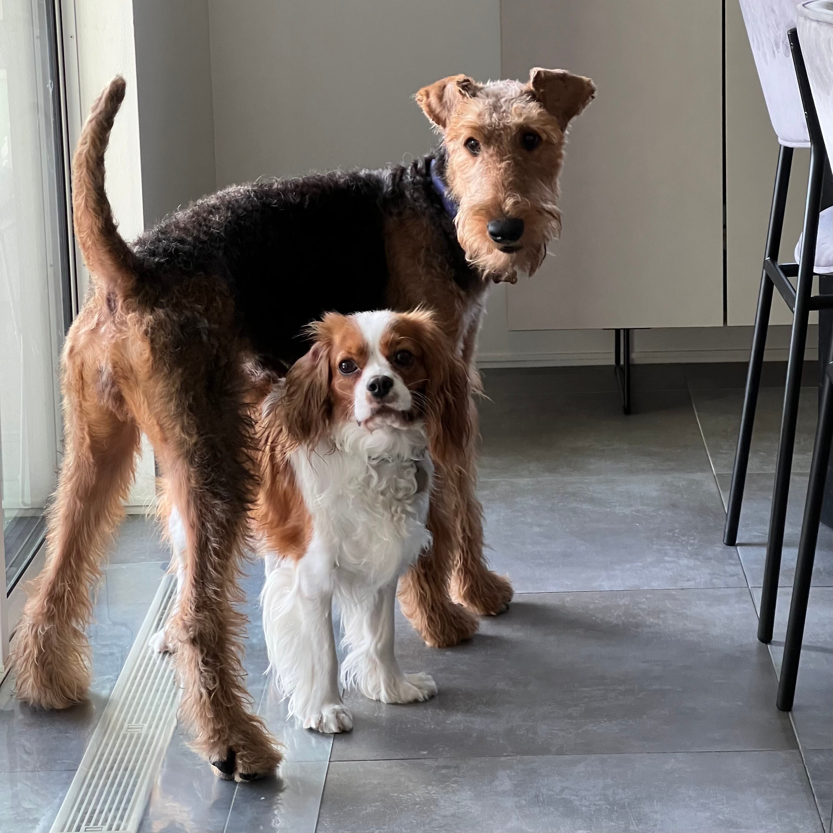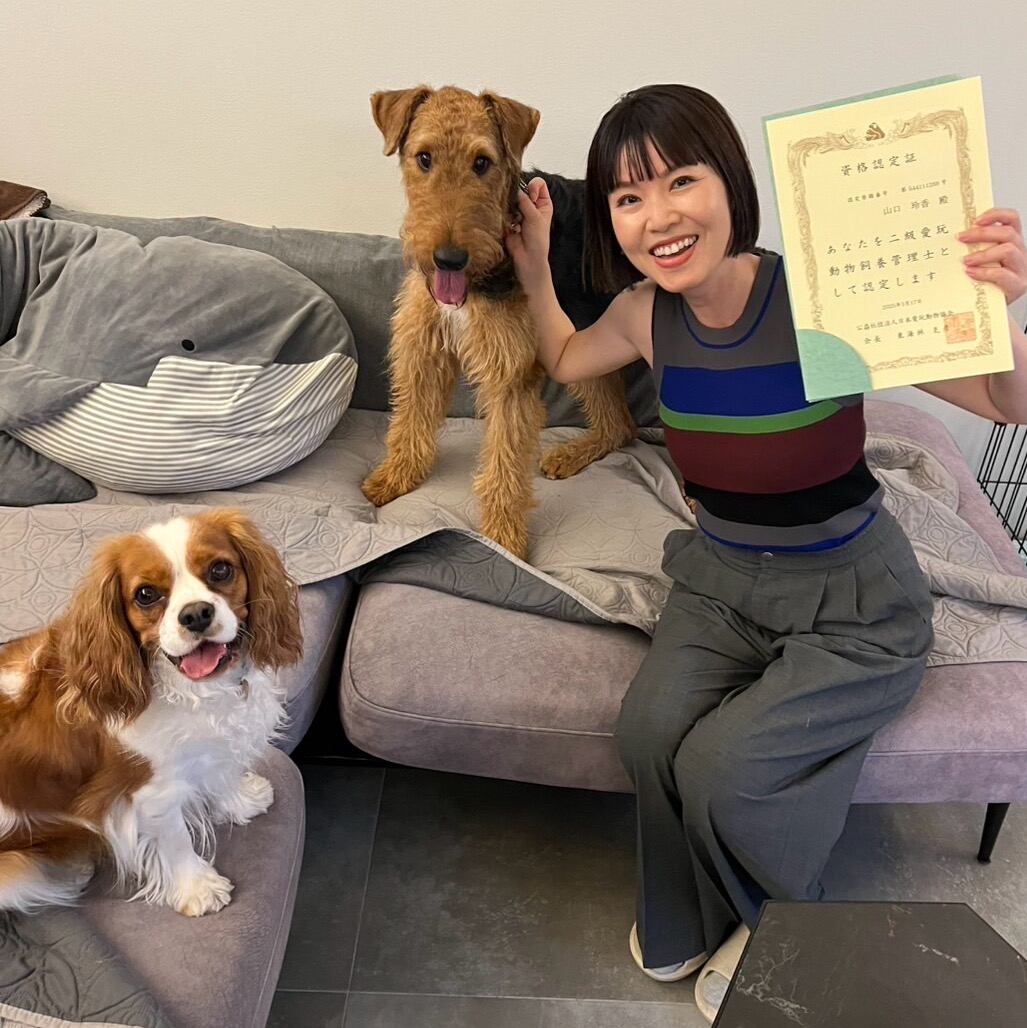 先代犬はプードルのパシャ、現在はキャバリアのマイルスとエアデールテリアのリリィを家族に迎えています。